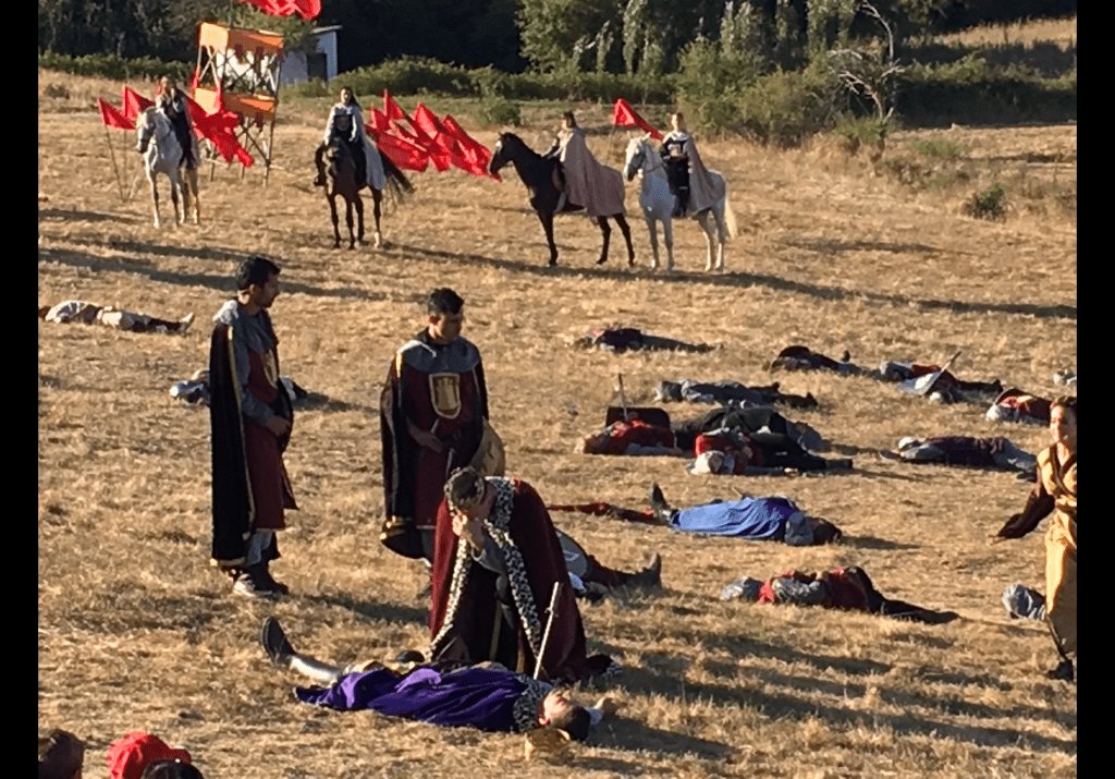 Fernando I de León llora sobre el cadáver de su hermano García III de Pamplona en la representación de la batalla de Atapuerca que se lleva a cabo todos los años en dicha localidad.