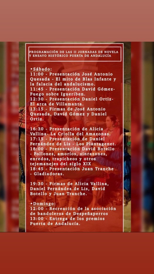 En estas jornadas acompañaré a buenos amigos como David Gómez, Alicia Vallina y Juan Tranche y a otros a los que tengo ganas de conocer como José Antonio Quesada, Daniel Ortiz y David Botello, que presentarán sus obras. Habrá también ocasión de departir con los asistentes y firmar ejemplares de nuestros libros para aquellos que lo deseen.